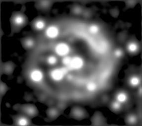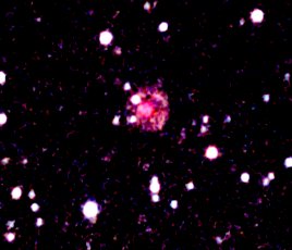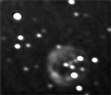 Ich musste mit Pseudofarben arbeiten, um überhaupt einen Kreis einzeichnen zu können, der mir die Bestimmung des Durchmessers erlauben soll. Interessanter und leichter erscheint mir aber die Wiederholung einer Feststellung, die ich bereits vor längerer Zeit machte und hier wohl auch gepostet haben dürfte: der Mittelpunkt des eingezeichneten Kreises (stellvertretend für den äußeren Umfang vom Lichtecho) stimmt nicht mit der Position von V838_Mon überein. Ob diese Positionsdifferenz sich vergrößert hat, werde ich demnächst mal untersuchen. Heute nur erst mal die Skizze, in der dies wohl ziemlich deutlich zu sehen ist.