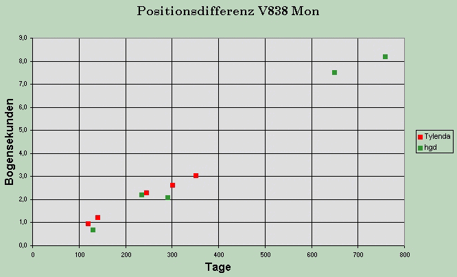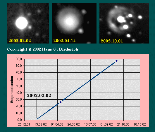 Wie bereits oben erwähnt, sind die Werte aufgrund der zeichnerischen Ungenauigkeit alles andere als exakt. Wichtig erscheint mir die Tendenz einer stetigen Verlagerung des Mittelpunkts vom Lichtecho weg vom Zentralstern V838 Mon.