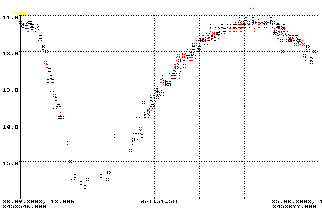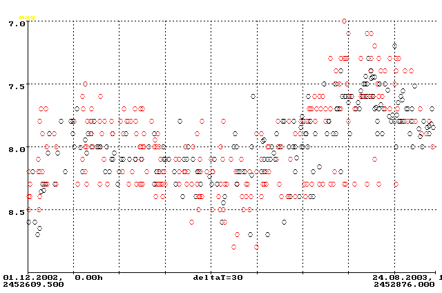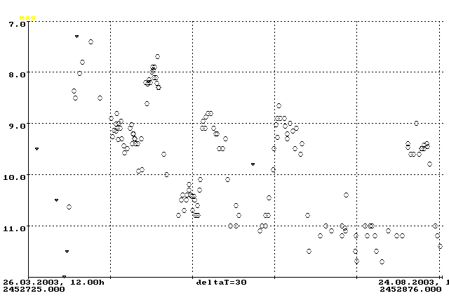 Aus der mittleren Lichtkurve des Sterns läßt sich ein kleines Minimum von 0.3 mag Tiefe im August 2002 erkennen, dem ein kurzer Anstieg um ebenfalls 0.3 mag im Januar/Februar 2003 folgte. Im Juni und Juli bewegte sich die Kurve wieder in Richtung eines Mini-Minimums.